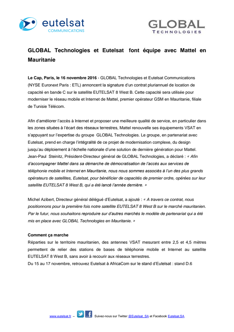 GLOBAL Technologies et Eutelsat Communications (NYSE Euronext Paris : ETL) annoncent la signature d’un contrat pluriannuel de location de capacité en bande C sur le satellite EUTELSAT 8 West B. Cette capacité sera utilisée pour moderniser le réseau mobile et Internet de Mattel, premier opérateur GSM en Mauritanie, filiale de Tunisie Télécom.