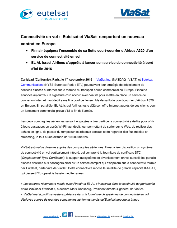 Carlsbad (Californie), Paris, le 1er septembre 2016 – ViaSat Inc.(NASDAQ : VSAT) et Eutelsat Communications (NYSE Euronext Paris : ETL) poursuivent leur stratégie de déploiement de services d’accès à Internet sur le marché du transport aérien commercial en Europe. Finnair a annoncé aujourd'hui la signature d’un accord avec ViaSat pour mettre en place un service de connexion Internet haut débit sans fil à bord de l’ensemble de sa flotte court-courrier d’Airbus A320 en Europe. En parallèle, EL AL Israel Airlines teste déjà son offre Internet auprès de ses clients pour un lancement commercial prévu d’ici la fin de l’année.