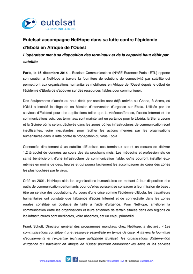 Paris, le 15 décembre 2014 – Eutelsat Communications (NYSE Euronext Paris : ETL) apporte son soutien à NetHope à travers la fourniture de solutions de connectivité par satellite qui permettront aux organisations humanitaires mobilisées en Afrique de l'Ouest depuis le début de l’épidémie d’Ebola de s’appuyer sur des ressources fiables pour communiquer.