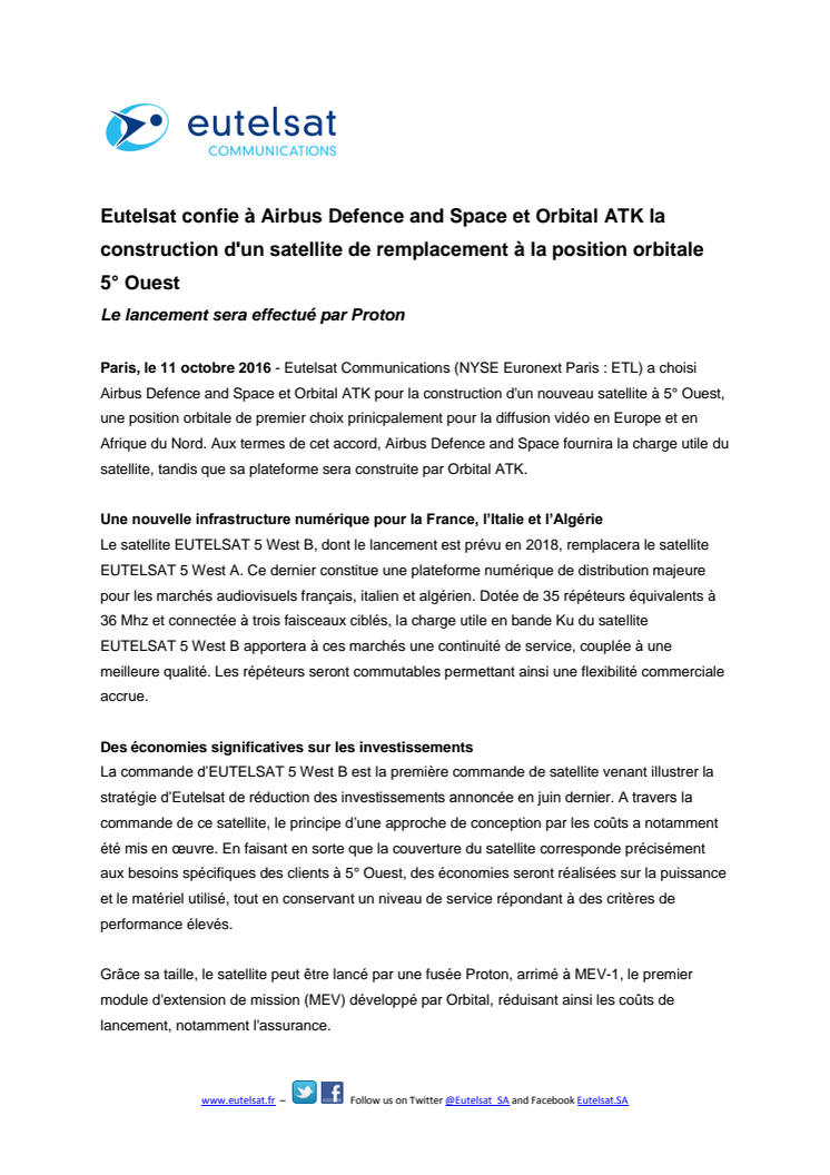 Paris, le 11 octobre 2016 - Eutelsat Communications (NYSE Euronext Paris : ETL) a choisi Airbus Defence and Space et Orbital ATK pour la construction d'un nouveau satellite à 5° Ouest, une position orbitale de premier choix prinicpalement pour la diffusion vidéo en Europe et en Afrique du Nord. Aux termes de cet accord, Airbus Defence and Space fournira la charge utile du satellite, tandis que sa plateforme sera construite par Orbital ATK.