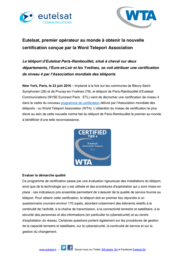 New York, Paris, le 23 juin 2016 – Implanté à la fois sur les communes de Bleury-Saint-Symphorien (28) et de Prunay-en-Yvelines (78), le téléport de Paris-Rambouillet d’Eutelsat Communications (NYSE Euronext Paris : ETL) vient de décrocher une certification de niveau 4 dans le cadre du nouveau programme de certification délivré par l’Association mondiale des téléports - ou World Teleport Association (WTA). L’obtention du niveau de certification le plus élevé au sein de cette nouvelle norme fait du téléport de Paris-Rambouillet le premier au monde à bénéficier d’une telle reconnaissance.