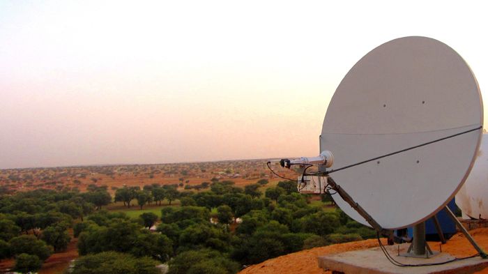 Réparties sur le territoire mauritanien, des antennes VSAT mesurant entre 2,5 et 4,5 mètres permettent de relier des stations de bases de téléphonie mobile et Internet au satellite EUTELSAT 8 West B, sans avoir à recourir aux réseaux terrestres.